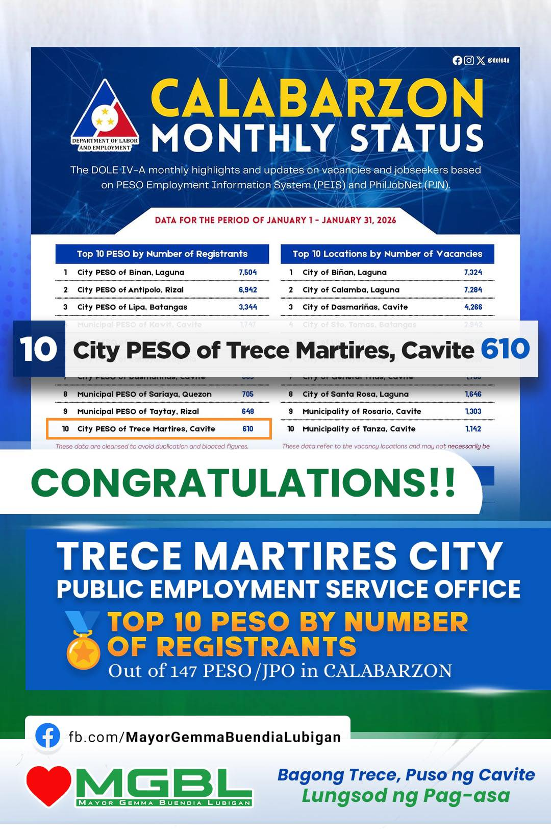 By Number of Registrants (January 2026) Out of 147 PESO/JPO in the region A recognition of PESO Trece Martires City’s commitment to effective employment facilitation and responsive public service. This…